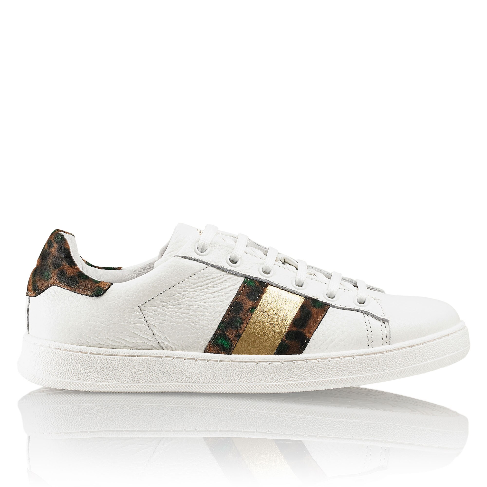 Russell & Bromley Women's White and Pink Calf Leather Suede Leopard Printed Hair Stripes Wildside Lace-Up Sneakers, Size: UK 6